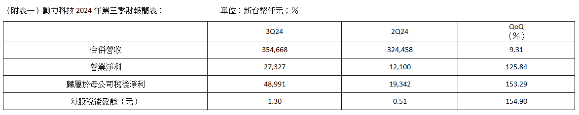 動力科技股份有限公司(6591)於今日公布2024年第三季合併營收達新台幣3.55億元,季增9.31%,受惠電競、高速運算相關需求仍保持穩定,加上持續深化營運成本及費用管控,挹注2024年第三季歸屬於母公司稅後淨利達4,899萬元,每股稅後盈餘(EPS)達1.30元,分別較上季成長153.29%、154.90%。