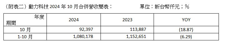動力同步公告2024年10月合併營收達92,397仟元,較去年同期減少18.87%,累計2024年1至10月合併營收為10.80億元,年減6.29%。展望2024年第四季,動力看好輝達計畫推出大改款的RTX50系列顯卡,預計將成為推動新一波換機潮的重要因素,且目前動力已開始與客戶進行新產品的前置相關準備,有助於推升動力良好成長趨勢。
