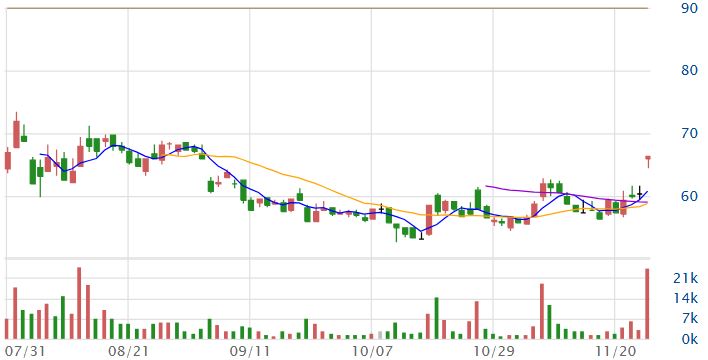 受此利多消息影響,和大今(26)日早盤以漲停價開出,報66.4元,漲幅9.93%,盤中交易量較昨(25)日全天交易量暴增近八倍。旗下高鋒也同喜,直奔漲停。