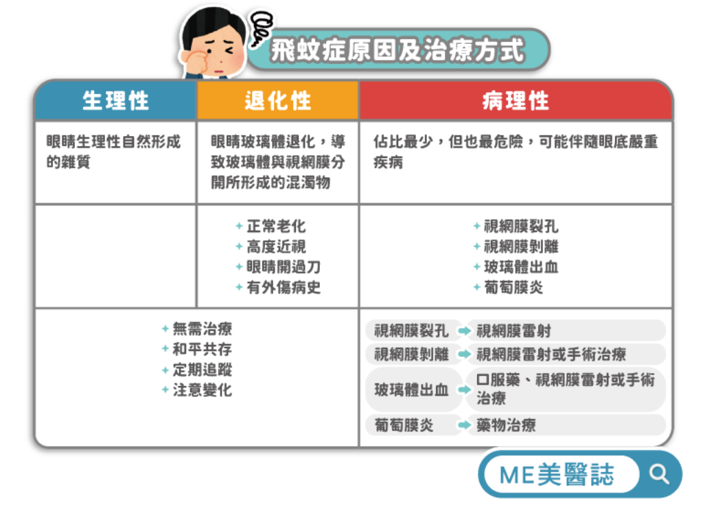 病理性飛蚊症通常需要積極的治療措施,尤其是當伴隨眼底病變時,更應該盡快處理。徐郁芳醫師指出,這些病變可能包括視網膜裂孔、視網膜剝離、玻璃體出血或眼球內發炎等,而治療方式包括藥物、雷射或手術,需要由專業醫師進行詳細、精密的檢查後,再評估適合的處理方法。