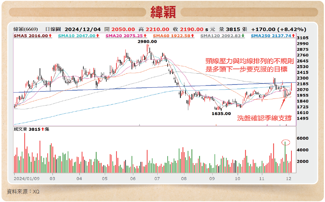 創意與緯穎處在面對頸線壓力的位置,緯穎可能進度快一些,因為11月27日爆大量長黑K已經收復,算是這次小V形洗盤的代表股,如果緯穎可以轉強表態的話,那麼AI伺服器概念股如鴻海、廣達、緯創、英業達、技嘉等個股也可望被帶起來,那麼就算外資想藉著打壓權值股來收割台指期空單獲利也不容易。