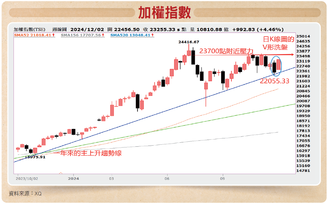 而本周前三個交易日累積992.83點、4.46%,如果12月6日收盤能夠維持23255.33點或之上的話,那麼多頭利用兩周的時間完成起漲前的V形洗盤,後續配合FOMC可能繼續降息一碼的利多,不排除投信趁著外資休聖誕長假之際,展開逼空回補行情。