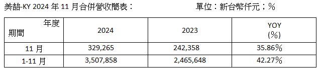國際石塑地板製造業者美喆國際(8466)於今日公布2024年11月合併營收達3.3億元,較去年同期大幅成長35.9%,單月營收已連續14個月呈現年增水準。累計2024年1至11月合併營收達35.1億元,同步較去年同期大幅成長42.3%,續創歷年同期新高之佳績。