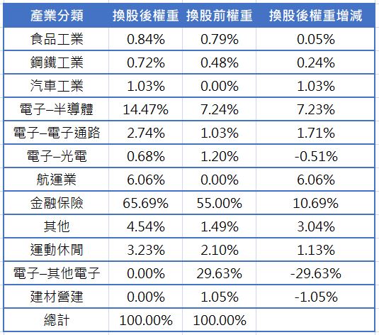 凱基台灣優選 30 ETF基金(證券簡稱:凱基優選30,證券代號:00938)已於12/2完成定審換股,共替換了14檔個股,換股後電子股權重由39%下降至18%、金融股由55%增加至66%、傳產股由4.4%提升至16%(表)。此次凱基優選30(00938)換股降低電子股權重、拉高金融股權重,可望以低波動、低評價兩大優勢渡過行情震盪期。