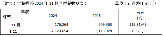 世豐公布2024年11月合併營收達1.76億元,較上月成長7.9%表現。累計2024年1至11月營收達21.21億元,較去年同期成長0.32%。展望2024年第四季,世豐除持續留意整體產業動向,集團仍看好美洲地區居家DIY應用領域、建築工業領域對於螺絲產品保持一定市場需求,加上不斷完善旗下利基型複合板螺絲、水泥板螺絲等多元螺絲產品線,同時與旗下客戶共同研發設計多功能性之客製化新產品,以利於滿足多元市場應用,並積極擴大建築工程、戶外與居家裝修業務接單及送樣機會,同時不斷進行客戶及產品銷售組合調整策略,以期創造未來營運正面效果挹注。