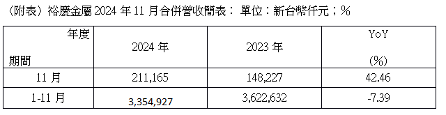 裕慶金屬股份有限公司(6957)於今日公布2024年11月合併營收達2.11億元,年增42.46%。累計2024年1至11月合併營收達33.55億元,年減7.39%。