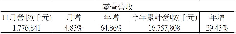 零壹11月營收達17.77億元,創單月歷史次高,月增4.84%,年增64.86%;累計今年前11月營收為167.58億元,年增29.43%,創同期新高。