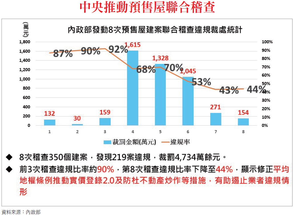 內政部打「炒房」,推動《平均地權條例》修法外,也進行八次合稽查行動。