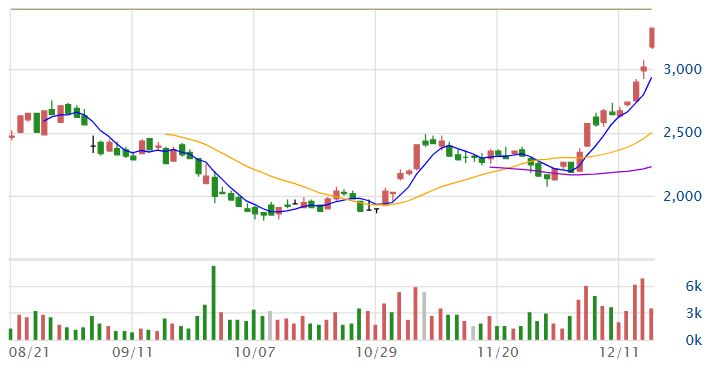 世芯-KY股價至月初開始發酵,今(17)日更是亮燈漲停,12月股價漲超過一千元,重回三千元大關,今(17)日更是亮燈漲停,盤中大漲300元,漲停價3320元,漲幅9.93%,截至上午9點46分成交量為3541張。