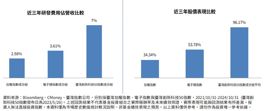 盤點市場上ETF中,野村臺灣新科技50(00935)追蹤指數採用研發費用指標。根據彭博、CMoney等資料顯示,臺灣創新科技50指數成分股近三年研發費用佔營收比平均達約7%,相比加權及電子類指數成分股的平均約2.58%與3.61%,再觀察近三年(2021/10/31至2024/10/31)股價表現,臺灣創新科技50指數成分股的近三年平均漲幅達約96.17%,勝過加權指數(約34.34%)與電子類指數(約53.78%)。