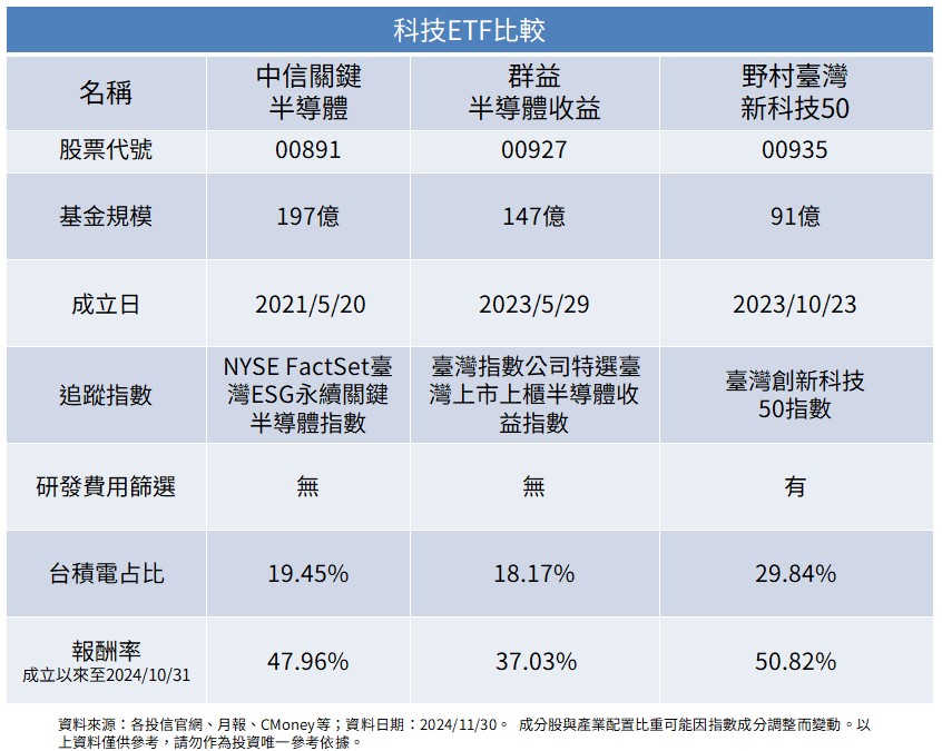以下比較科技股的相關ETF,從追蹤指數來看,可知中信關鍵半導體(00891)、群益半導體收益(00927)以半導體產業為主軸,再綜合其他指標來進行篩選。其中,00935追蹤指數奠基於FactSet RBICS Level 6總計的73個次產業,再綜合考量財務指標、成長指標(研發費用佔營收比重)、動能指標等,聚焦50檔持續投入研發創新的公司。