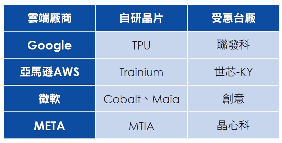 Google內部沒有ASIC技術及團隊,便找上了博通,利用其豐富的IC設計經驗及IP資源開發新款AI晶片TPU,亞馬遜AWS則與麥威爾及台廠世芯-KY合作,打造Trainium晶片,微軟找上創意開發Maia及Cobalt晶片,據傳OPEN IA也向博通下了訂單,預計在2026年啟動。