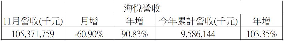海悅11月營收為10.5億元,較上月減少60.9%,但較去年同期增加90.83%,並已連續19個月維持成長;累計今年前11個月營收達95.8億元,年增幅高達103.35%。然而,11月稅前淨損0.35億元,年減112.05%,稅後純損0.24億元,年減111.94%。