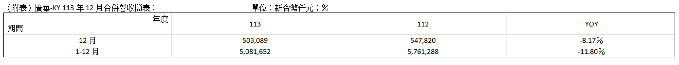 廣華控股有限公司(1338)公布 113年12月合併營收為新台幣5.03億元,較上月營收成長10.87%,繳出連續2個月單月營收月增率正成長;113年第四季合併營收為新台幣13.97億元,較第三季營收成長20.04%;累計113年全年合併營收為新台幣50.82億元,較112年全年營收減少11.8%。