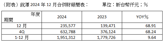 高科技廠房氣體供應系統解決方案領導廠商銳澤實業股份有限公司(7703) 於今日公布2024年12月合併營收達2.36億元,年增68.91%,創歷年單月新高。2024年第四季合併營收6.33億元,季增35.05%、年增68.24%,寫下歷年單季新高記錄。累計2024年全年合併營收達19.51億元,年增9.64%,創歷年同期次高。