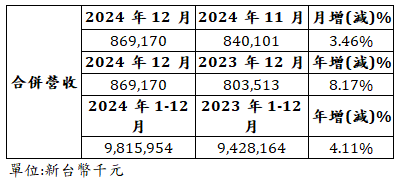 - 營收加快成展:2024年12月營收年增率(YOY),大幅成長8.17%,高於11月營收3.46%(MOM成長率)。