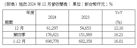台灣自有品牌過濾大廠旭然國際(4556)今日公佈2024年12月合併營收達6,130萬元,呈月增13%、年增12%水準,創歷年同期新高表現。累計2024年第四季合併營收達1.77億元,年增16%,亦刷新歷年同期新高佳績。累計2024年全年合併營收達6.99億元,年增16%,改寫歷年同期次高水準。