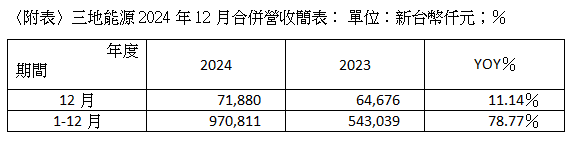 全方位再生能源整合服務商三地能源股份有限公司(6946)於今日公布2024年12月合併營收7,188萬元,年增11.1%,創歷年同期新高。累計2024年全年合併營收達9.71億元,年增78.8%,繳出歷年新高成績。