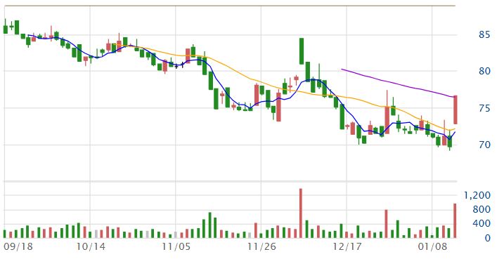 公司實施庫藏股後,長佳智能今(14)日盤中強漲9.89%,亮燈漲停,股價報76.7元。