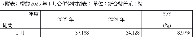 胎壓偵測器(TPMS)大廠橙的電子股份有限公司(4554)今日公布2025年1月合併營收達新台幣3,719萬元,較去年同期成長9%,並改寫近7年來同期新高水準。
