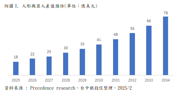 DeekSeek以低成本開發出AI運算模型,將有助於全球人形機器人加速智能化。研究機構預估,2030年全球人形機器人產值超越40億美元,2034年產值逼近80億美元(如下圖1),長期硬體成本可能落於2萬美元上下;服務型機器人受惠於生成式AI技術的快速進步,對市場吸引力顯著增加,台廠相關供應鏈中,具備關鍵零組件生產能力、且有完整解決方案的公司,將可望受惠。