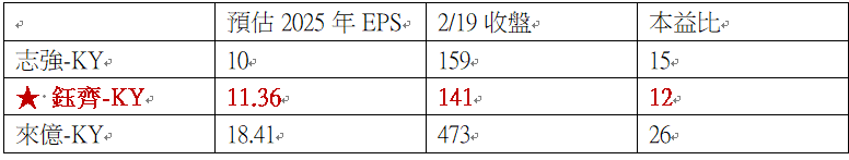 鈺齊-KY代工家數已達50家,前三大占比約5成,今年將加速擴廠,法人預估,2025年EPS可達11.36元,本益比12倍。