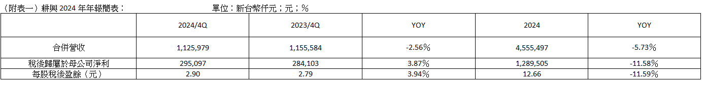 耕興股份有限公司(6146) 於昨日(2/19)董事會後公告2024年全年營運成果。耕興2024年第四季合併營收為11.26億元,合併毛利率50%,合併稅前淨利為3.86億元,歸屬於母公司稅後淨利為2.95億元,年增3.87%,稅後每股盈餘(EPS)2.90元,年增3.94%;累計2024年全年合併營收為45.55億元,合併毛利率50%,合併稅前淨利為16.77億元,歸屬於母公司稅後淨利為12.9億元,稅後每股盈餘(EPS)12.66元。