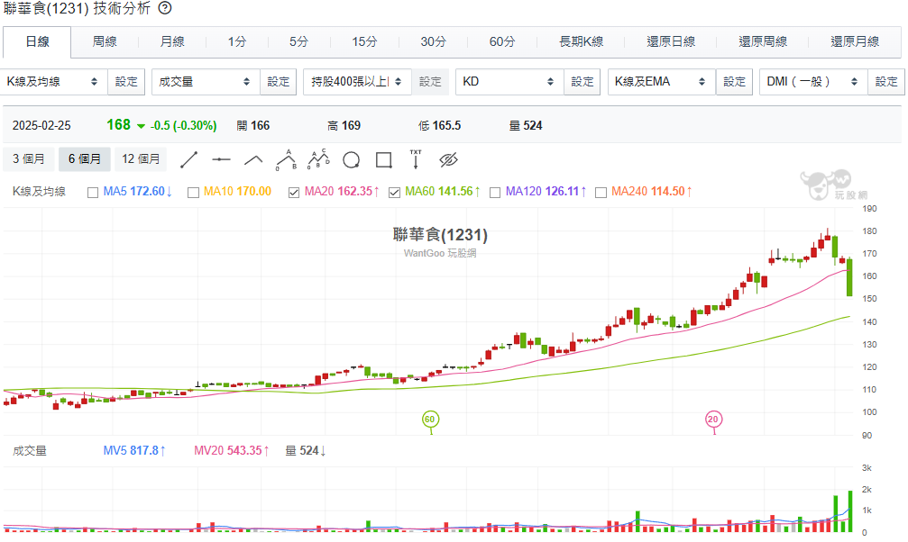 從基本面來看,聯華食品2024年業績與過去相當,全年EPS維持在4元左右。然而,隨著近年多數股票本益比上調,使許多股票價格都向上走高,聯華食與其他食品股比較起來,漲幅相對的多出許多。在市場擔憂2025年成長趨緩,特別是2025年市場相對不穩定的情況下,需求相對減弱,進一步加劇投資人的疑慮,促使主力逢高獲利了結。