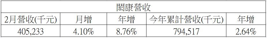 2月最新營收為4.05億元,月增4.1%,年增8.76%;今年1至2月累計營收為7.9億元,年增2.64%。