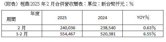 桓鼎股份有限公司(5543)於今日公布2025年2月合併營收2.4億元,較去年同期微幅增加0.63%。累計2025年1至2月合併營收達5.54億元,年增6.55%,創歷年同期次高記錄。