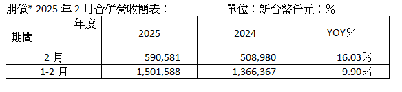 朋億*累計前2月營收達15.02億元 創歷年同期新高 年增9.9%