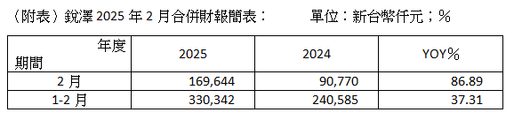 銳澤營運保持成長動能,受惠去年下半年起半導體主要客戶新廠計畫推進,並加速拉升先進製程、先進封裝每月產能,同步帶動銳澤旗下氣體二次配拆移機服務訂單需求熱度,助力公司單月合併營收已連續三月締造歷年同期新高,2月合併營收更大幅年增86.89%之關鍵。