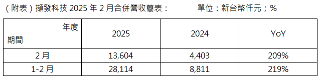 專注「ASIC設計服務」與「AI軟體設計平台」服務的擷發科技(MICROIP) (7796) 公告2025年2月營收達1,360萬,較2024年2月的440萬元成長209%;累計2025年1至2月營收達2,811萬元,較去年同期881萬元成長219%。