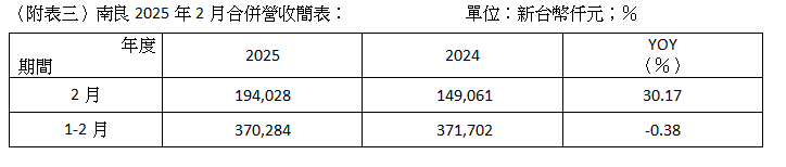 南良於3月10日公布2025年2月合併營收達1.94億元,較去年同期1.49億元增加30.17%;累計2025年1至2月合併營收達3.70億元,較去年同期3.72億元,營收表現持平。南良前2月營收表現主要受惠於海棉事業部台灣市場銷售量回升,以及中國大陸東莞廠針對護具與醫療防護類產品出貨量增加所致,帶動海棉事業部前2月營收年增率達9.8%,中和其他事業部出貨的表現,貢獻整體南良國際營收保持持穩。