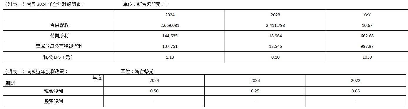 在財務上仍保持穩健的表現,為回饋股東長期支持,南良於3月12日董事會決議通過2024年擬配發每股0.5元現金股利,配發率達44.25%。以3月12日收盤價18.7元計算,現金殖利率約為2.67%,期望將公司營運成果與全體股東共享。