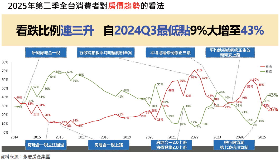央行打房威力逐漸顯現,根據永慶房屋調查,去(2024)年第二季看跌房價的比例只有9%,但央行九月祭出第七波信用管制後,到今年第一季的比例,一下子就拉升至43%, 看跌比例連三升。