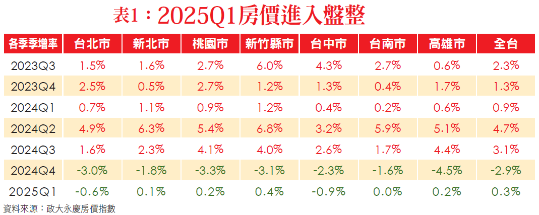 但央行九月的限貸令及第七波信用管制威力發效後,Q4七都都由正轉負,其中,高雄下跌幅度高達4.5%,若由Q3的正4.4%到負4.5%,下修最明顯。而2025年Q1房價指數則漲跌互見,幅度都不大。
