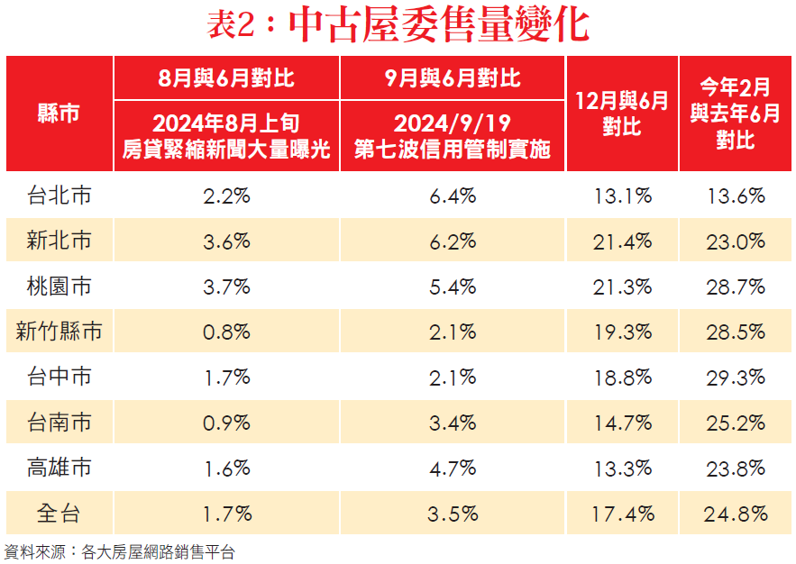 另若以919第七波信用管制後,相比六月的委售量更是增加。此外,若以今年二月相比去年六月來說,委售量增加的幅度更驚人,全台要賣房的人增加24.8%(表二)。