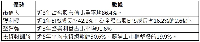 台股大型股具備四大優勢,包括市值大、獲利優、營運強、投資報酬勝。據CMoney及Bloomberg統計至去年底,在整體台股市場中,近三年台股市值300大企業的市值占比平均達到86.4%,近3年營業利益占比平均高達91.6%,創造台股逾九成獲利。在EPS及投資報酬方面,台股市值300大企業近一年EPS成長率達到42.2%,為整體台股EPS成長率的2.6倍,且近5年平均投資總報酬率30.6%,勝過台股上市櫃企業的19.9%。