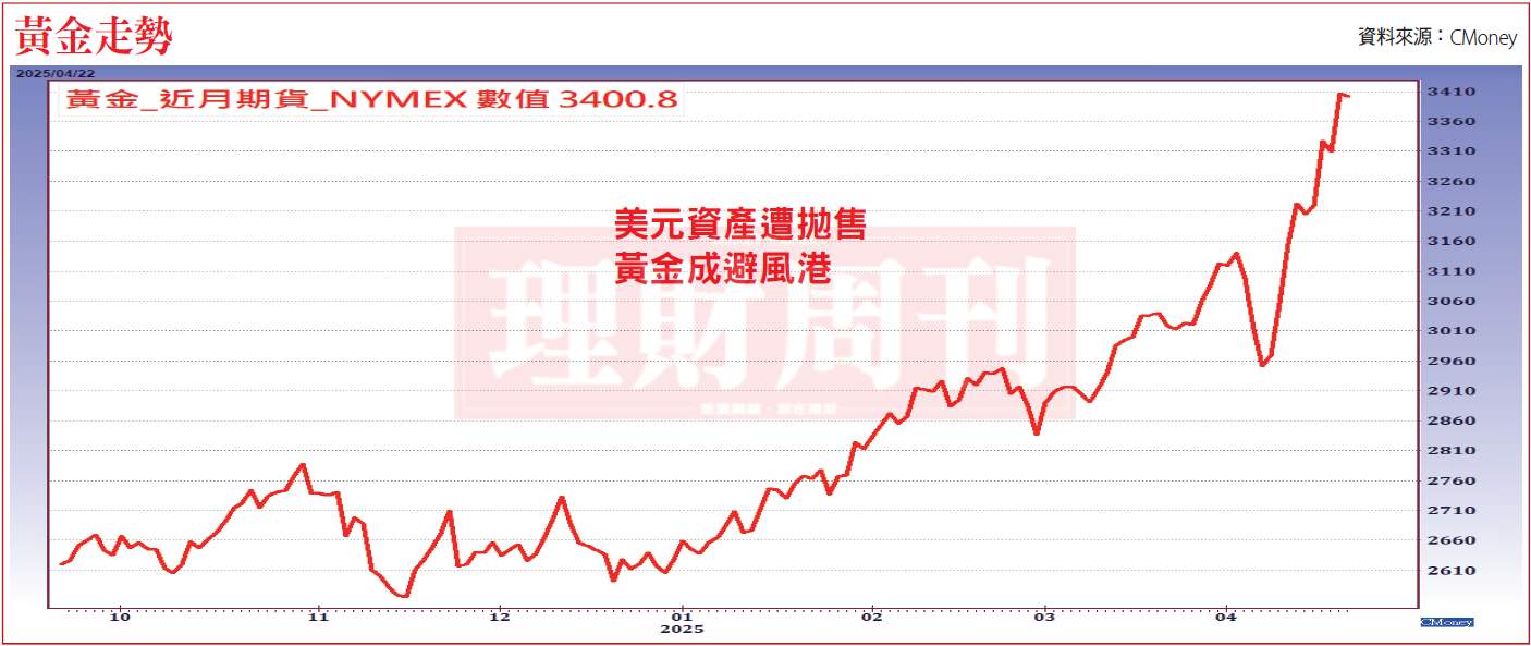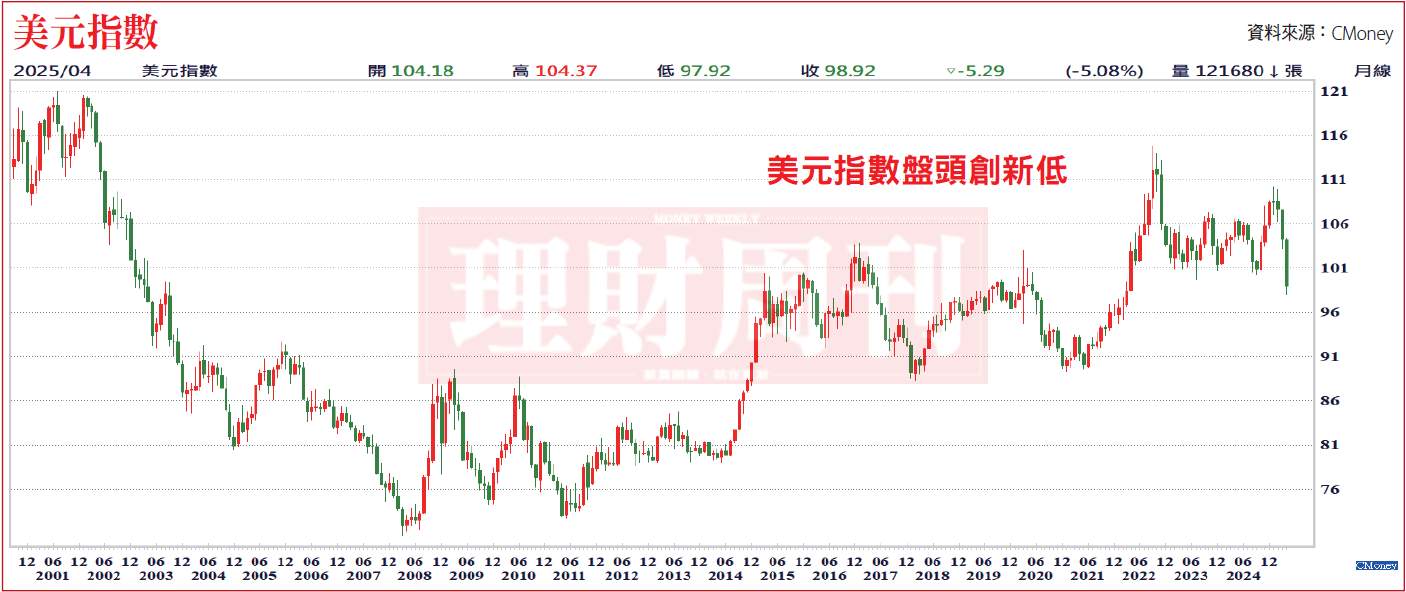 繼美股、美債大跌後,上周美元指數跌破98點,最低見到97.91點,美元資產遭到拋售,除了關稅戰,聯準會獨立性受到挑戰,尤其5月7日就是FOMC利率會議,根據《路透社》報導,白宮國家經濟會議(NEC)主席哈塞特4月18日在白宮被記者問及「是否可能撤換鮑爾」時回答,「總統和他的團隊將繼續研究此事。」川普不滿鮑爾遲遲不降息,二十四小時內三次公開砲轟聯準會主席,揚言「不降息就解雇」。