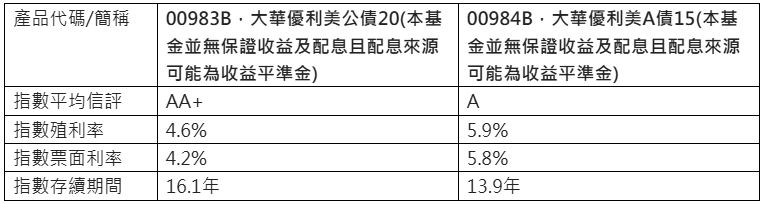 看準投資人對於優質收益的需求,大華銀投信至本周五(4/25)隆重募集「大華銀優利ETF傘型基金」,旗下包含(00983B)大華優利美公債20與(00984B)大華優利美A債15。
