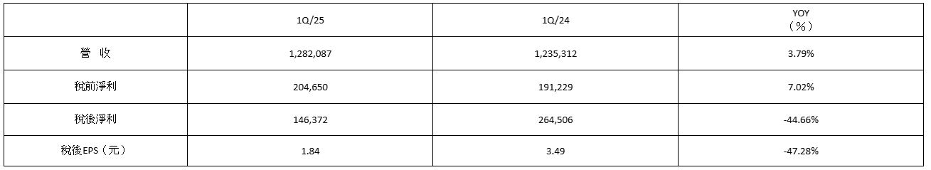 劍麟(2228)於今日公布2025年第一季合併營收達新台幣12.82億元,年增3.79%,受惠旗下膝蓋式及側邊安全氣囊與氣簾、預縮式安全帶精密導管等產品良好出貨表現,帶動整體產能稼動率保持良好水準,挹注第一季稅前淨利達2.05億元、稅後淨利達1.46億元、每股稅後盈餘(EPS)達1.84元,雖去年同期因大陸子公司盈餘轉增資產生遞延所得稅迴轉利益1.27億元(約當EPS 1.67元)墊高比較基期,若排除此因素,劍麟2025年第一季每股稅後盈餘(EPS)優於去年同期水準,且為過去四季最佳。