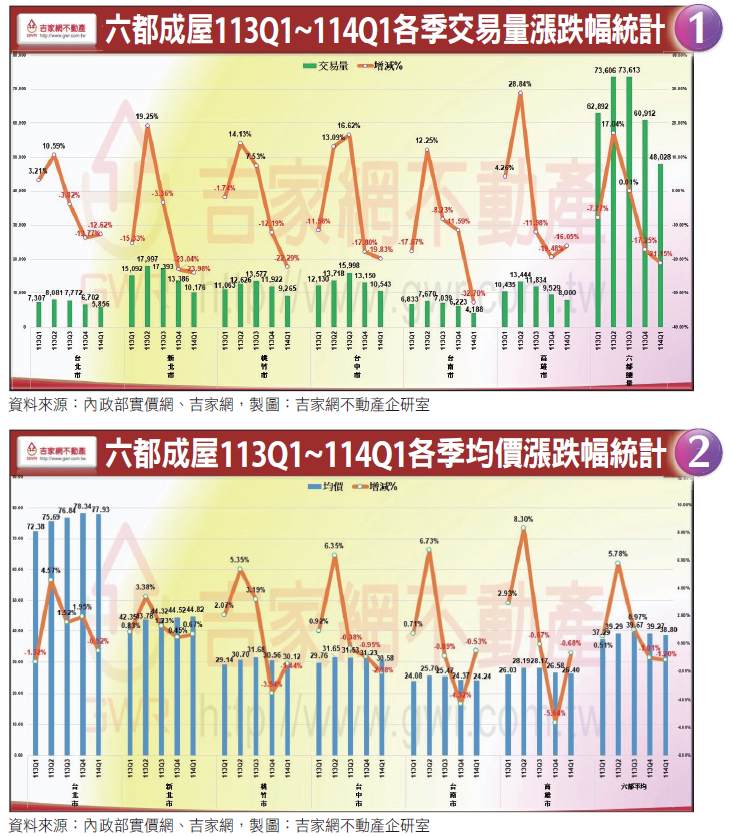 吉家網公布2025年Q1成屋市場季報,六都房市表現價量俱跌,均價微跌1.2%,季交易量62,892棟創九年新低,除新北市仍小漲0.67%。由於六都均價與交易量連續兩季下跌,空頭明顯確立,全台房市由南至北、由多轉空,進入下修階段。