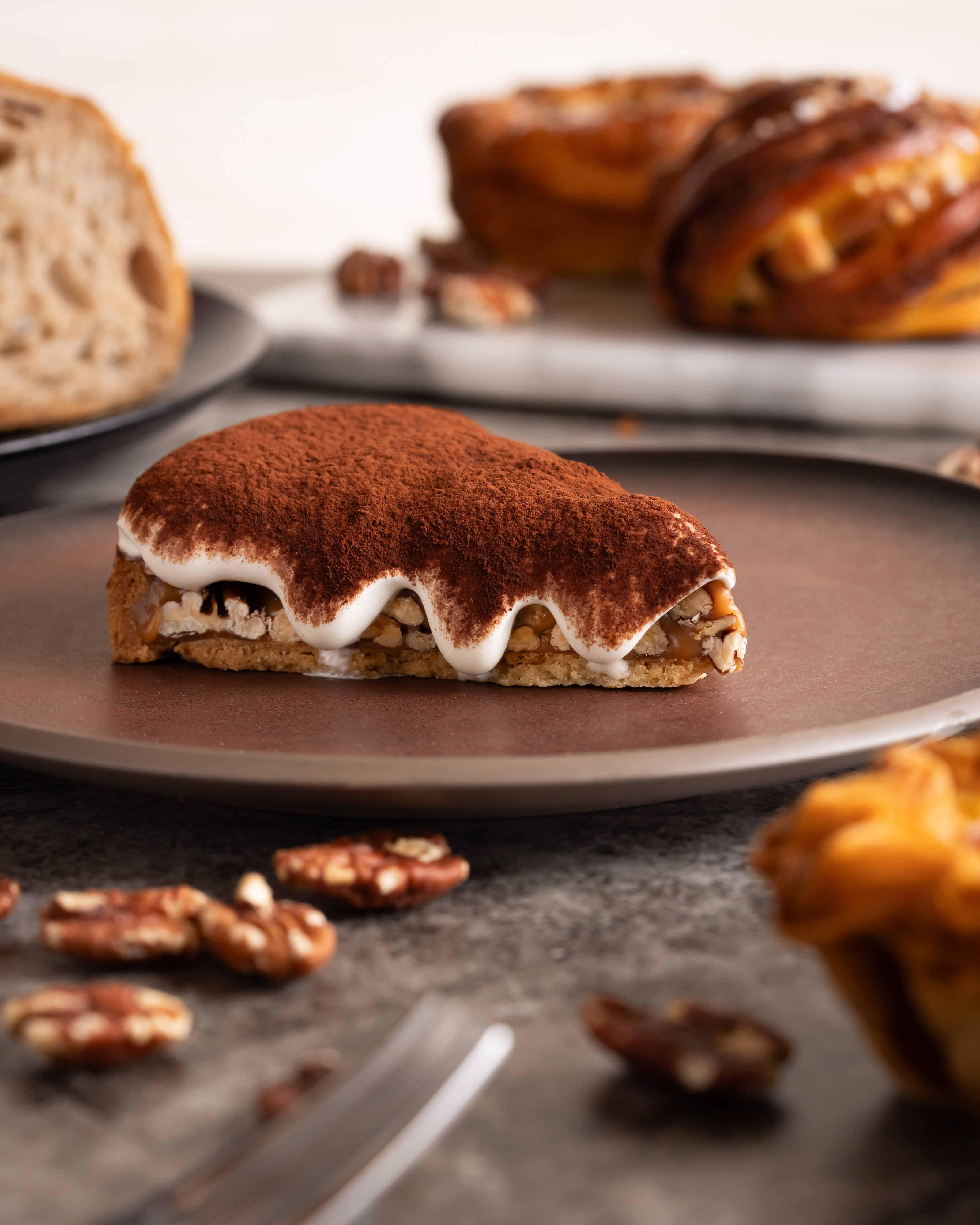 有了鹹食,必不可少的甜食也值得推薦。在101餐廳每月熱銷千塊的胡桃派,用焦糖醬將片片胡桃緊密組合,上方則是無糖奶油與可可粉,一上桌還以為是提拉米蘇,切開才知道充滿驚喜。不過於甜膩、更沒有令人害怕的黏牙感,是只有SALT&STONE才找的到的最強風味。香蕉派則是另一款擁有熱情守護者的甜點,不同於常見的千層派皮,SALT&STONE烘焙主廚池宮秀三堅決使用酥脆餅皮作為基底,填入海鹽焦糖醬、香蕉卡士達、新鮮香蕉片、巧克力、無糖鮮奶油,份量稍大,甜蜜滋味卻總讓人只想獨自佔有。