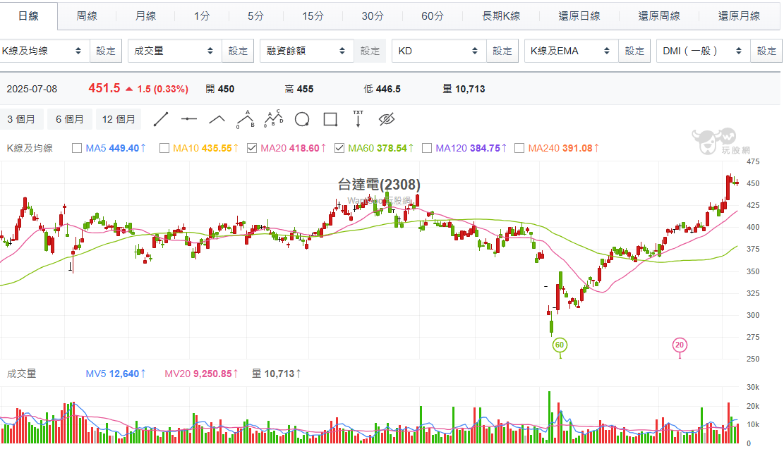 2025年以來,台達電(2308)股價強勢上攻,短短三個月漲幅超過65%,歷史新高來到461.5元,市值接近1.2兆元,超越富邦金(2881),成為台股市值第四大公司。這波漲勢背後,有法人資金大舉進場的強力推升,截至7月7日,外資持股高達173萬張、投信持有逾85,000張。
