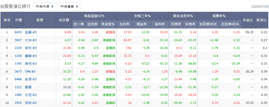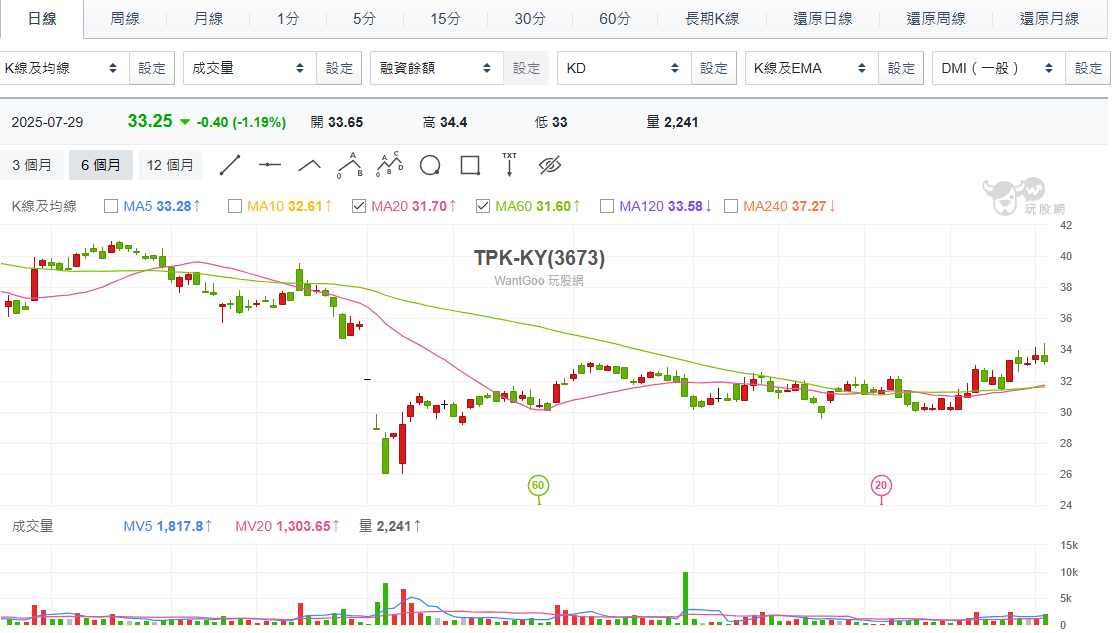 從近期的股價淨值比(P/B)排行來看,TPK-KY 的股價僅為帳上淨值的三分之一,目前股價約 33.25 元,而 2025 年第一季每股淨值則高達 100.24 元。雖然 KY 股常面臨帳面淨值可能因匯率換算而高估的風險,尤其第二季台幣強升、人民幣相對弱勢的背景下,對財報表現形成壓力。但在台股普遍估值偏高、資金快速輪動的情勢中,TPK-KY 這類「被忽略、但具備低股淨比優勢」的冷門股,在具備題材之下,反而更有機會吸引主力資金提前卡位,出現補漲行情。