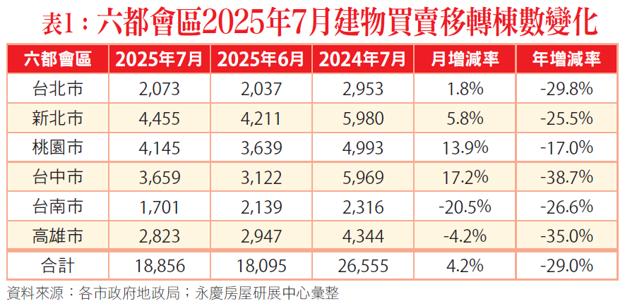 六都會區公布2025年7月「建物買賣移轉棟數」,六都交易量合計為18,856棟。永慶房屋研展中心副理陳金萍說明,6月六都建物買賣移轉棟數月增4.2%,六大都會區增減互見,台南市與高雄市量縮,分別月減20.5%與4.2%,其餘四大都會區均較6月量增,其中,台北市月增1.8%,新北市月增5.8%,桃園市月增13.9%,台中市月增17.2%(表一)。