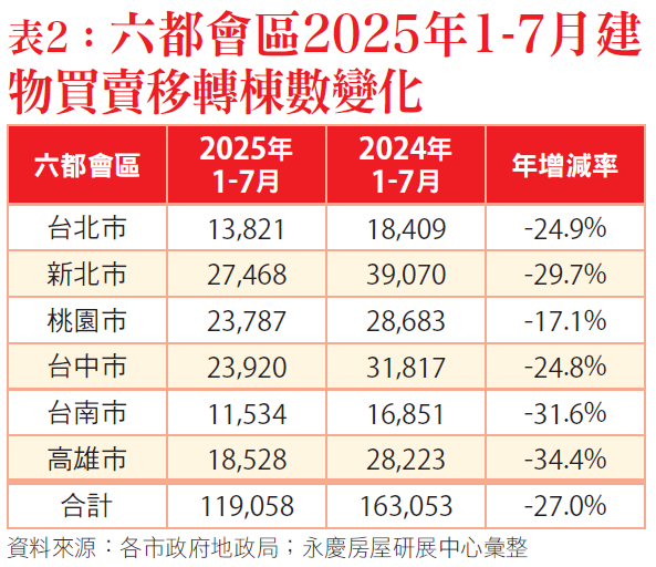進一步觀察今年1-7月六大都會區建物買賣移轉棟數,六都整體交易量合計為119,058棟,較去年同期年減27.0%,顯示今年房市交易相對低迷。其中台北市年減24.9%,新北市年減29.7%,桃園市年減17.1%,台中市年減24.8%,台南市年減31.6%,高雄市年減34.4%(表二)。