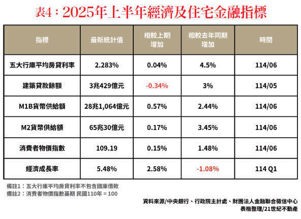 另就資金環境來看,中央銀行資料顯示,2025年6月五大銀行平均房貸利率升至2.283%,年增4.5%,創下十六年新高水位。然而資金供給並未收緊,M1B與M2年增率分別為2.44%與3.45%,顯示市場流動性仍維持寬鬆水位。