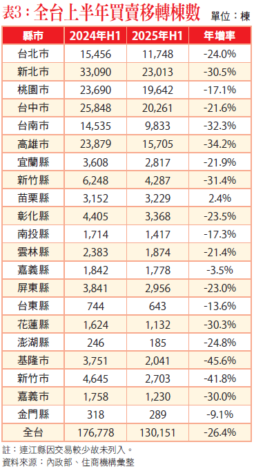 住商機構指出,根據內政部數據,全台縣市上半年買賣移轉棟數皆呈現衰退,各縣市跌幅約一至四成左右;其中,基隆市上半年買賣移轉棟數達2,041棟,年跌幅達45.6%,創2006年以來最低(表三)。
